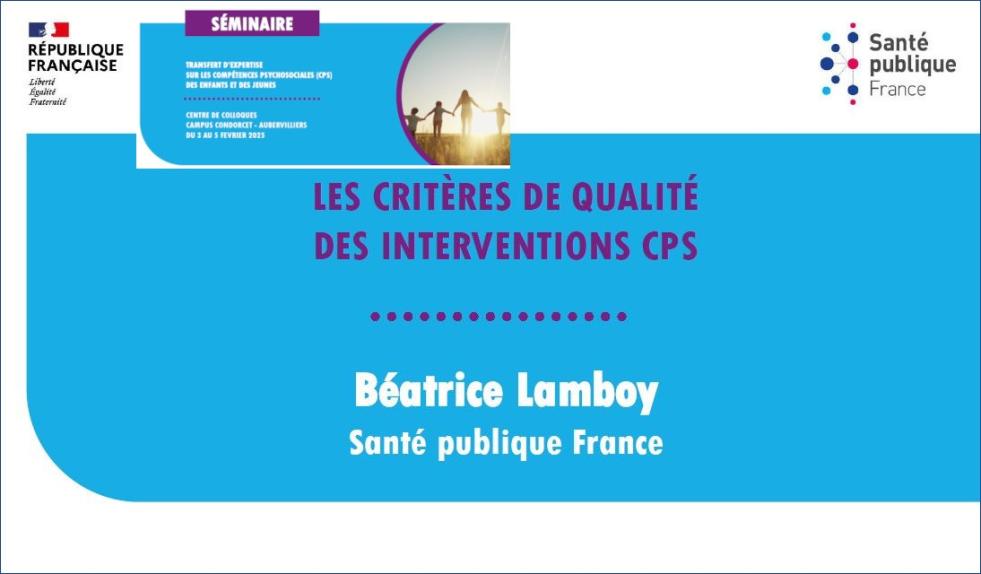This presentation was given at the seminar on psychosocial skills (PSS) organized by Santé publique France from February 3 to 5, 2025, in Aubervilliers. Béatrice Lamboy, scientific advisor and co-leader of the PSK program at Santé publique France, presents the quality criteria for PSK interventions to help participants internalize these criteria, thereby enriching the content of their PSK training and ultimately optimizing it.