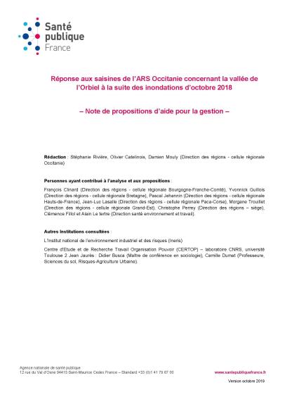 This memo presents the response to the questions posed by the Occitanie Regional Health Agency (ARS) to Santé publique France in the referral dated May 10, 2019, following the floods that occurred in the Orbiel Valley in October 2018. It follows on from previous referrals (the 1997 referral from the National Public Health Network—now Santé publique France—and the 2014 referral from the Institute for Health Surveillance—now Santé publique France). The questions raised concern in particular (i) the need to conduct epidemiological studies or update previous studies following the October 2018 floods; (ii) the need to continue considering only arsenic as a pollutant likely to impact health; and (iii) the interpretation of environmental data obtained in the flooded areas. This document provides preliminary answers and 12 recommendations to guide management measures.