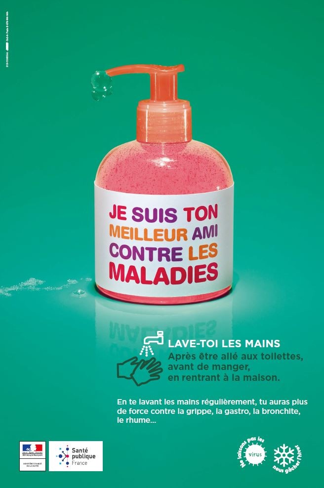 This poster, which shows a liquid soap dispenser, is aimed at children. It conveys the following messages: "Wash your hands after using the restroom, before eating, and when you get home" and "By...
