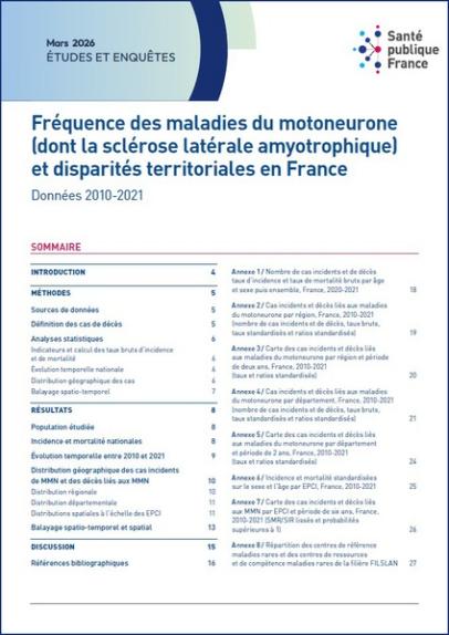 Motor neuron diseases (MNDs), of which amyotrophic lateral sclerosis (ALS, or Charcot’s disease) accounts for 90% of cases, have a major health and social impact. They are notably addressed in the 4th National Plan for Rare Diseases 2025–2030 and the National Strategy for Neurodegenerative Diseases (ND) 2025–2030. For several years, Santé publique France has been conducting epidemiological surveillance of these conditions, providing regional incidence and mortality indicators that are useful for scaling regional information, care, and support services; responding to reports of suspected spatio-temporal clusters; and guiding basic research into possible etiologies. These new results, calculated using medical-administrative data from the National Health Data System, update the estimates previously available through 2015—at the national, regional, and departmental levels—for mainland France and the DROMs (excluding Mayotte) through 2021, and enable a more refined analysis of the geographic distribution of cases at the EPCI (public intermunicipal cooperation establishments). They include an investigation of geographic areas with potential excess incidence or excess mortality. The standardized incidence of MMN is 3.0 to 3.5 cases per 100,000 inhabitants per year, comparable to European data. It is higher among men than among women and increases with age, also consistent with international observations. The standardized mortality rate (2.7 to 3.0 per 100,000), similar to the incidence rate, reflects the high case-fatality rate of these conditions and the short interval between diagnosis and death. No significant temporal trends in the evolution of incidence or mortality were observed between 2010 and 2021 after standardization by age and sex (the observed increase in crude rates may be attributable to population aging), with the exception of a decline in the number of cases in 2020, which could be linked to diagnostic delays during the COVID-19 pandemic. Spatial analysis reveals a heterogeneous geographic distribution of cases across regions, departments, and EPCIs, with areas of excess incidence and excess mortality relative to the national average, confirmed by the results of spatio-temporal scans, although no robust recurring spatial patterns were formally identified at the EPCI level, except potentially in Brittany (incidence and mortality), in Auvergne-Rhône-Alpes (incidence or mortality), and on the border between Occitanie and PACA (incidence only).