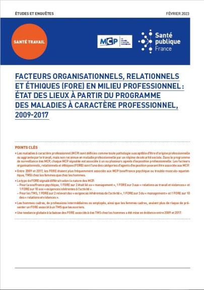 Occupational diseases are defined as any condition that may be work-related or exacerbated by work, but not recognized as an occupational disease by a social security system. In the occupational disease surveillance program, each reported occupational disease is linked to one or more occupational exposure agents. Organizational, relational, and ethical factors (OREF) are one of the categories of exposure agents that may be associated with ODDs. Between 2009 and 2017, OREFs were more frequently associated with ODDs (psychological distress or musculoskeletal disorders, MSDs) among women than among men. The type of FORE reported differed depending on the nature of the MCPs. - For psychological distress, 1 in 2 FOREs was related to "management," 1 in 3 to "workplace relationships and violence," and 1 in 10 to "job-related demands." - For MSDs, 1 in 2 FOREs was related to "job-related demands," 1 in 3 to "management," and 1 in 10 to "workplace relationships and violence." Male managers, those in intermediate professions, or clerical workers, as well as female managers, were at greater risk of having a FORE associated with an MSD than manual workers. An overall downward trend in FOREs associated with MSDs among men was observed between 2009 and 2017.