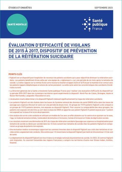 VigilanS is a post-discharge program designed to re-engage patients who have attempted suicide, with the goal of reducing repeat suicide attempts. Patients receive monitoring by a team of “vigilants” for a period of six months following a suicide attempt. The monitoring involves providing a resource card (with a 24/7 hotline number) and maintaining contact with patients (through phone calls and postcards). The monitoring varies depending on the characteristics of the individuals who have attempted suicide (whether they are repeat offenders or not). The Directorate General for Health commissioned Santé publique France to conduct an effectiveness evaluation of the program over the 2015–2017 period in the first six regions that piloted the program: Nord-Pas-de-Calais, Brittany, Upper and Lower Normandy, Languedoc-Roussillon, and Jura. The evaluation aimed to determine whether the VigilanS system significantly reduced the risk of repeat suicide attempts. VigilanS patients were linked in the National Health Data System (SNDS) databases and/or in the emergency department visit databases (Oscour) and followed over a twelve-month period. A group of 11,573 VigilanS patients was compared to a group of 11,573 control patients who were not exposed to the VigilanS system. To ensure comparability between the two groups, unexposed patients were randomly selected from the SNDS database and matched with VigilanS patients (1 exposed patient to 1 unexposed patient) based on a propensity score. A survival analysis was conducted using a Cox model with a random effect for the center and adjusting for sex, age, mode of the initial attempt, history of previous attempts at enrollment, year of enrollment, and the social deprivation index. The results show a 38% reduction in the risk of repeat suicide attempts (visits to the emergency department or hospitalization for a suicide attempt or death by suicide) within 12 months of their suicide attempt among VigilanS patients compared to the group of unexposed patients. A health economic evaluation comparing the funds invested in the VigilanS program to the costs of prevented suicide attempts and deaths was also conducted. It estimates that every €1 invested in the VigilanS program would save €2 in healthcare costs. The rollout of the VigilanS system is part of the national suicide prevention strategy. By 2023, 32 VigilanS centers will be established. They will cover all French regions, including overseas territories (the Indian Ocean, the Antilles, and French Guiana).