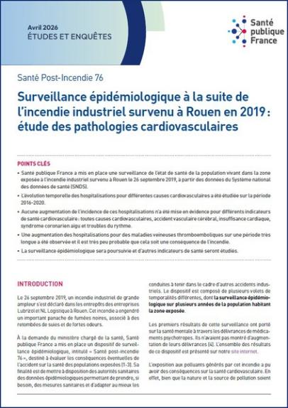 Santé publique France has established a surveillance system to monitor the health status of the population living in the area exposed to the industrial fire that occurred in Rouen on September 26, 2019, using data from the National Health Data System (SNDS). The results presented here concern the incidence of cardiovascular diseases.; The trends in hospitalizations for various cardiovascular causes were studied.; No increase in the incidence of these hospitalizations was observed for various cardiovascular health indicators: all cardiovascular causes, stroke, heart failure, acute coronary syndrome, and arrhythmias.; An increase in hospitalizations for venous thromboembolic diseases over a very long period was observed, and it is unlikely that this is a consequence of the fire.; Epidemiological surveillance will continue, and other health indicators will be studied.