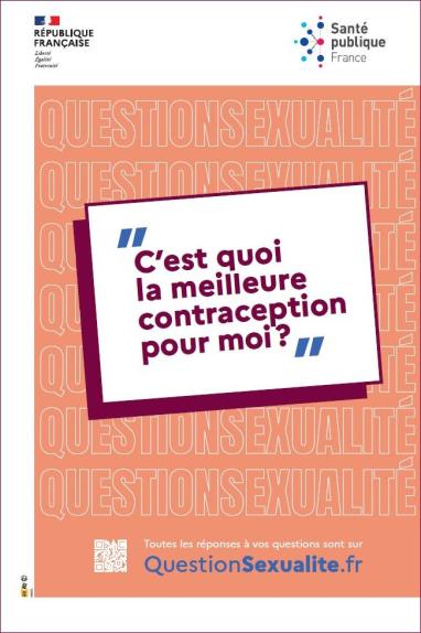 Published in conjunction with Sexual Health Week 2023, this poster encourages people to visit the QuestionSexualite.fr website to learn about all methods of contraception. Tagline: "What’s the best birth control method for me?" This document is intended for adults.
