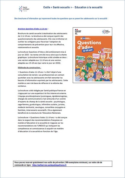 This brochure on sexual health is intended for adolescents aged 11 to 14. The document was developed based on questions raised by adolescents. It aims to inform and empower middle school students...