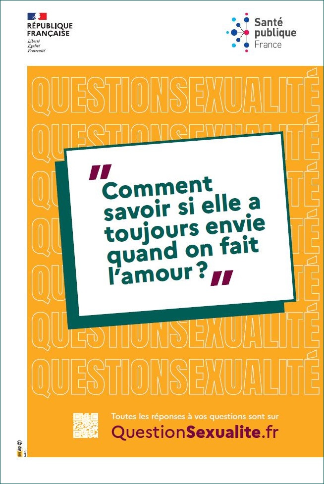 Published in conjunction with Sexual Health Week 2023, this poster encourages people to visit the QuestionSexualite.fr website to learn more about consent. Tagline: "How do you know if she always...