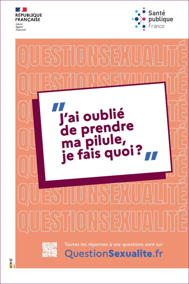 Published in conjunction with Sexual Health Week 2023, this poster encourages people to visit the QuestionSexualite.fr website to learn more about contraception. Tagline: “I forgot to take my...