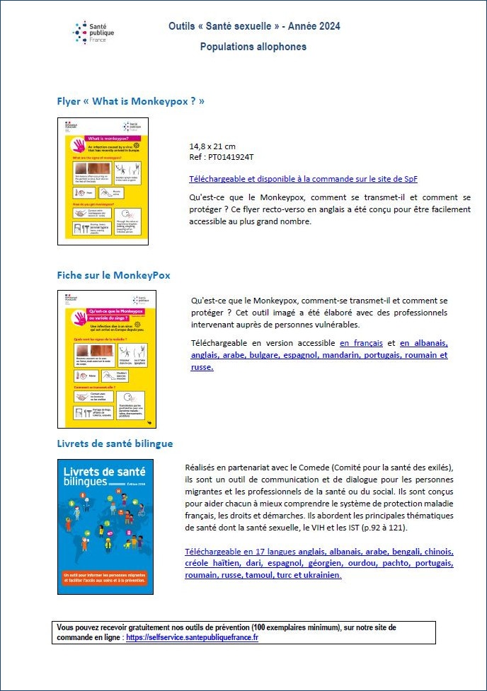 This 2024 catalog presents sexual health resources produced by Santé publique France for non-French-speaking populations—that is, people who live in France but whose first language is not French.