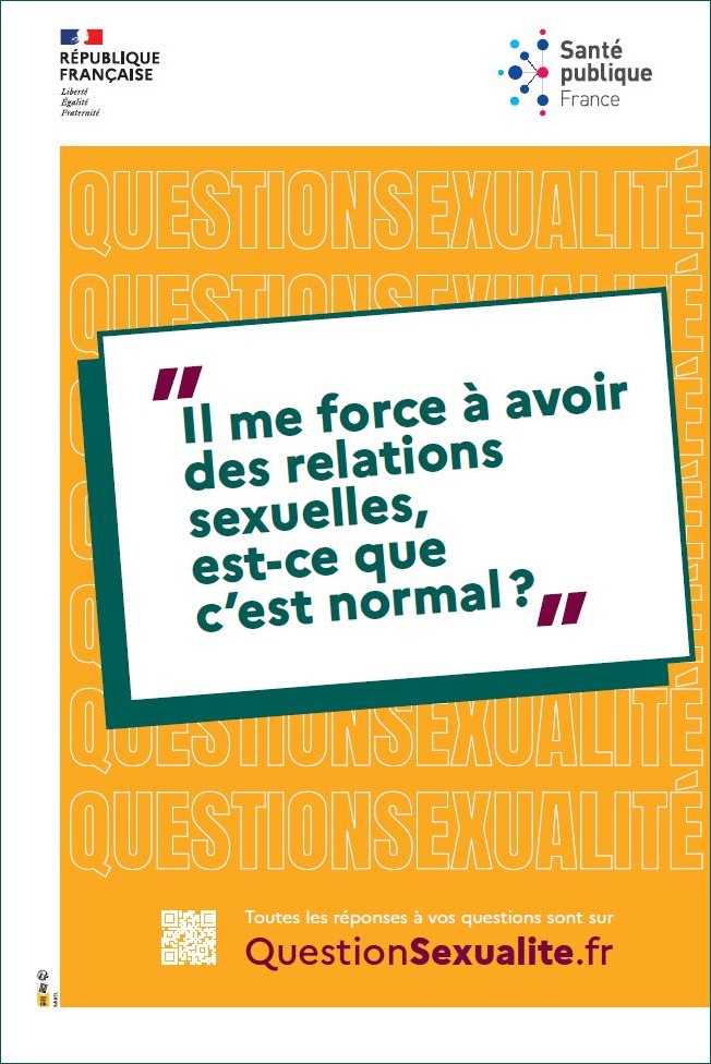 Published in conjunction with Sexual Health Week 2023, this poster encourages people to visit the QuestionSexualite.fr website to learn more about sexual violence. Tagline: "He’s forcing me to...