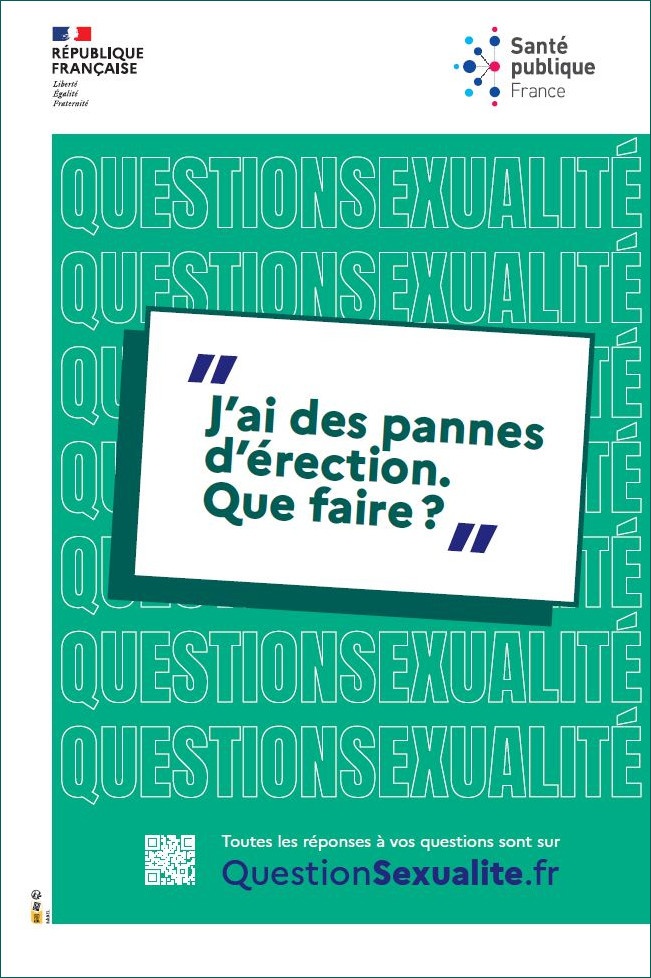 Published in conjunction with Sexual Health Week 2023, this poster encourages people to visit the QuestionSexualite.fr website to learn more about erectile dysfunction. Tagline: "I'm having...