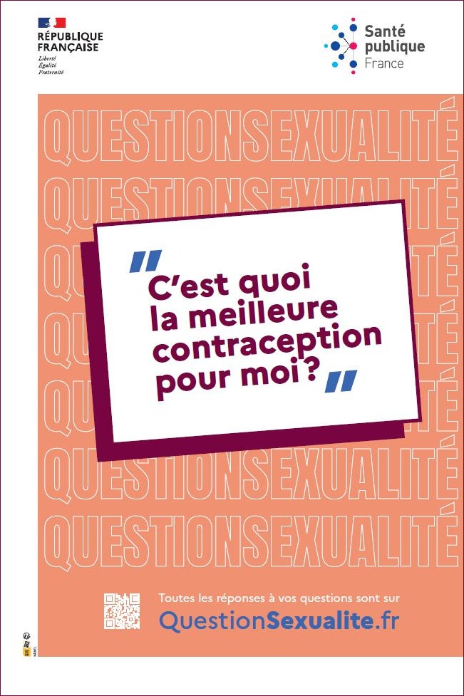 Published in conjunction with Sexual Health Week 2023, this poster encourages people to visit the QuestionSexualite.fr website to learn about all methods of contraception. Tagline: "What’s the...