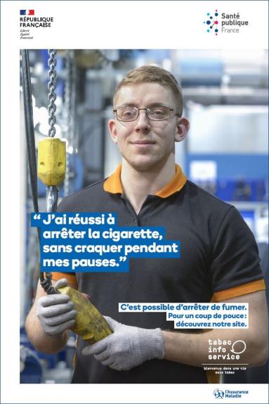 A poster encouraging people to quit smoking and promoting smoking cessation aids from Tabac Info Service, targeted at workplaces in the industrial and manufacturing sectors.