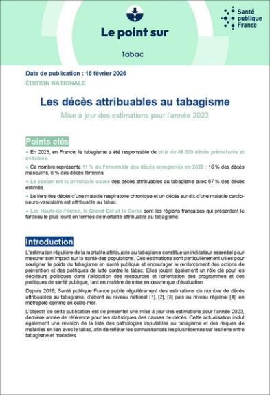 In 2023, in France, smoking was responsible for more than 68,000 premature and preventable deaths. This figure represents 11% of all deaths recorded in 2023: 16% of deaths among men and 6% of deaths among women. Cancer is the leading cause of smoking-related deaths, accounting for 57% of estimated deaths. One-third of deaths from chronic respiratory disease and one in ten deaths from cardiovascular and cerebrovascular disease are attributable to tobacco. Hauts-de-France, Grand Est, and Corsica are the French regions with the highest burden of mortality attributable to smoking.