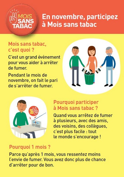 Information flyer for the "Smoke-Free Month" campaign. It explains the program, why you should participate, and how to register on the Tabac Info Service website.
