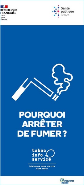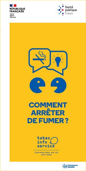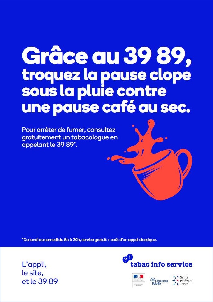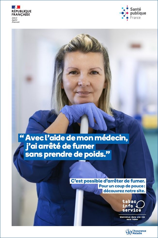 Poster encouraging people to quit smoking and promoting smoking cessation aids from Tabac info service, for healthcare facilities.