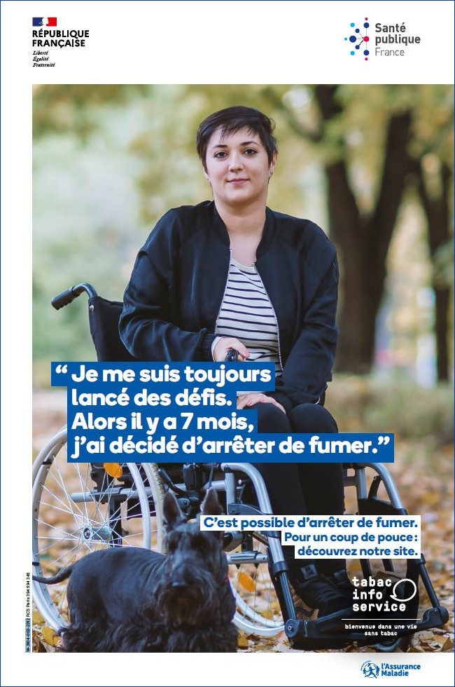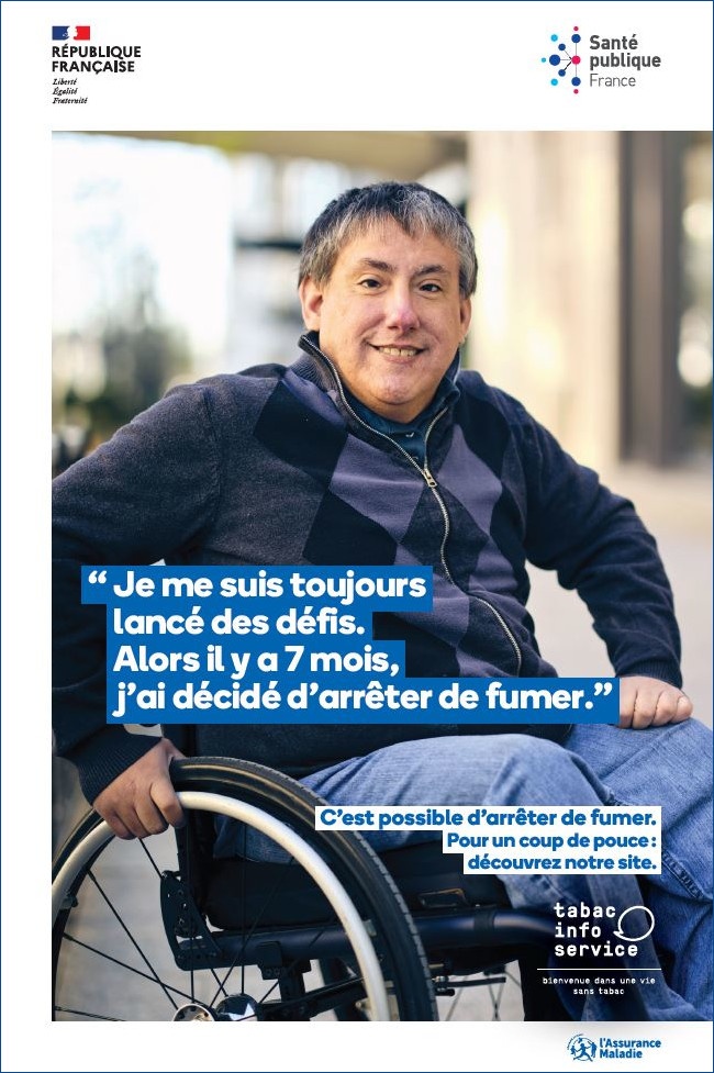 A poster encouraging people to quit smoking and promoting the smoking cessation resources offered by Tabac info service to people with disabilities.