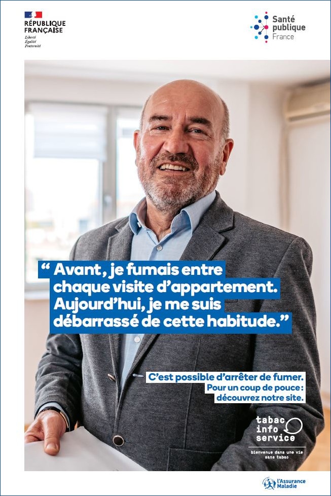 A poster encouraging people to quit smoking and promoting smoking cessation aids from Tabac info service, displayed in real estate workplaces.