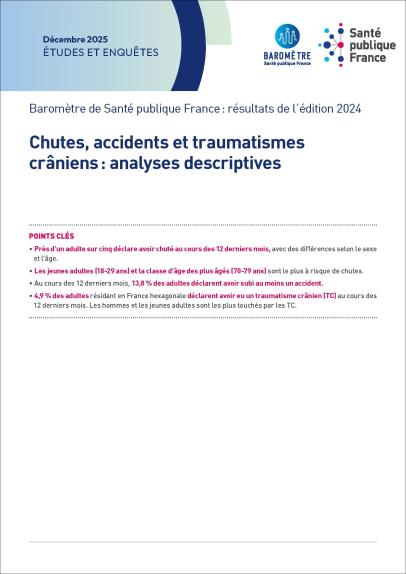 Nearly one in five adults reports having fallen in the past 12 months, with variations by gender and age. Young adults (ages 18–29) and the oldest age group (ages 70–79) are at the highest risk of falling. Over the past 12 months, 13.8% of adults report having experienced at least one accident. 4.9% of adults living in mainland France report having suffered a head injury (HI) over the past 12 months. Men and young adults are most affected by HIs.