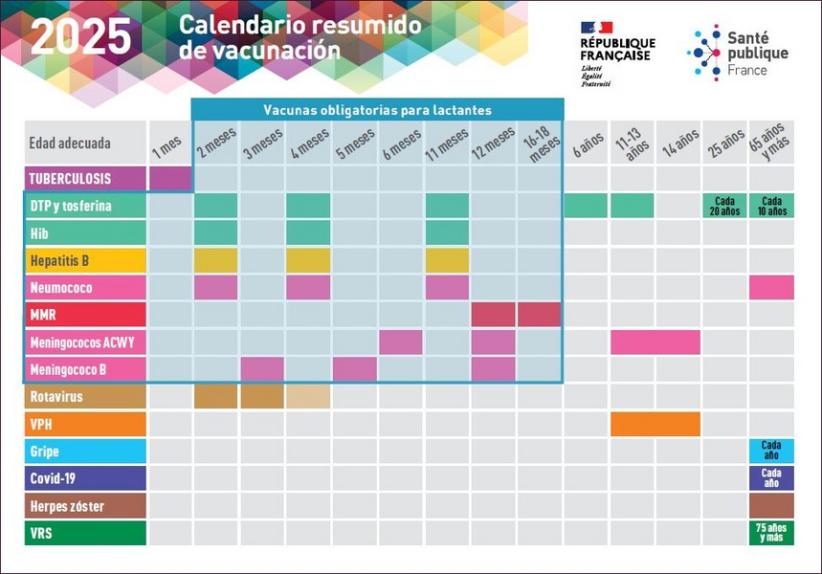 Postcard, in Spanish, featuring the simplified 2025 vaccination schedule. It lists the vaccines recommended for individuals at every stage of life and based on their specific circumstances. It summarizes, by age group, the vaccines needed to build basic immunity and provides guidance on boosters and potential delays in the vaccination schedule.