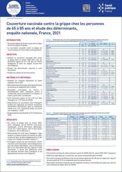 This poster, presented at the 25th National Infectious Diseases Conference, summarizes the results of the estimate of influenza vaccination coverage for the 2020–2021 season among people aged 65 to 85 in mainland France and the overseas regions (excluding Mayotte) based on data from the 2021 Public Health France Barometer survey. The factors associated with vaccination and the reasons for non-vaccination are explored.