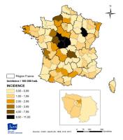 The year 2010 was marked by a national hepatitis A outbreak linked to the consumption of sun-dried tomatoes (BEH No. 13-14). The metropolitan departments with the highest incidence rates for 2010, Yonne and Haute-Marne, experienced clusters of cases among populations living in temporary camps for travelers under poor sanitary conditions.