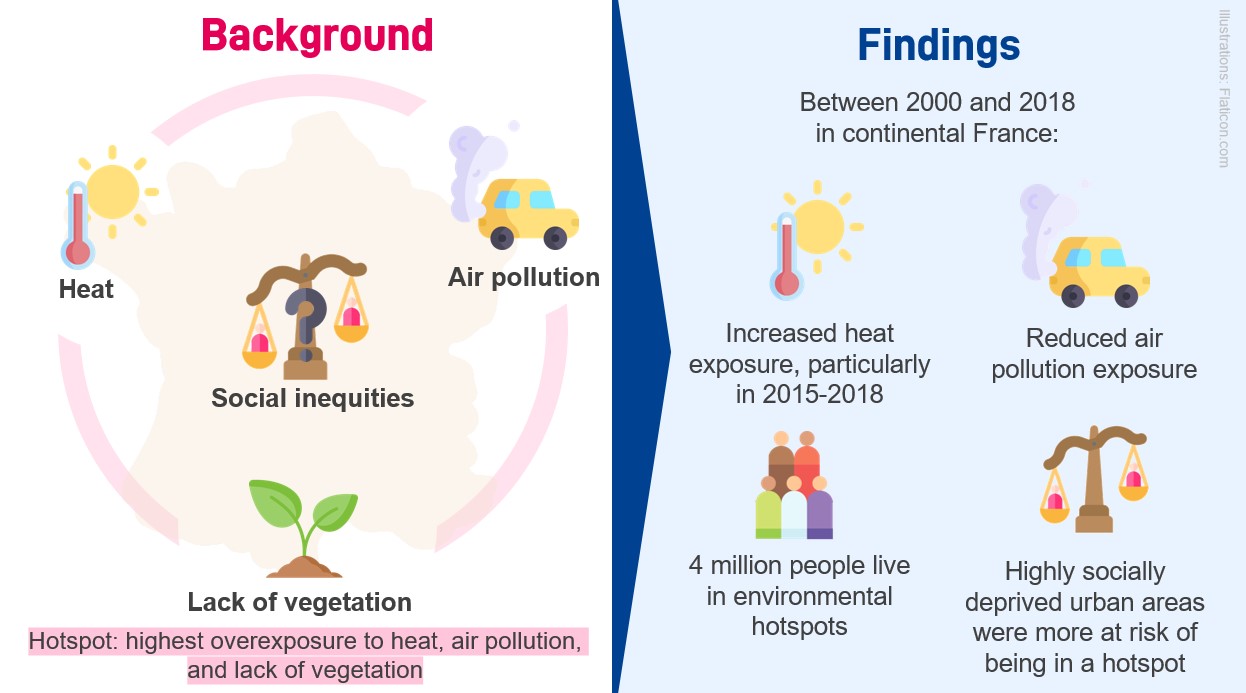 Exposure to environmental risk factors such as heat and air pollution, and the benefit attained from the development of green spaces, are important health determinants. The extent of exposure to these factors depends on geographical context (rural, urban, impact of land development on soil) and the interplay of complex physical mechanisms (e.g. impact of vegetation on air pollution and temperature, and vice versa). Exposure can also have synergistic effects on health. Heat and air pollution are associated with an increased risk of mortality and morbidity, as well as harmful effects on perinatal health. Conversely, the presence of vegetation reduces the risk of mortality and is positively associated with perinatal health. The most disadvantaged populations are more severely affected because they are more exposed to these risks and have fewer opportunities to benefit from green spaces due to structural factors, leading to environmental and social inequalities in health.