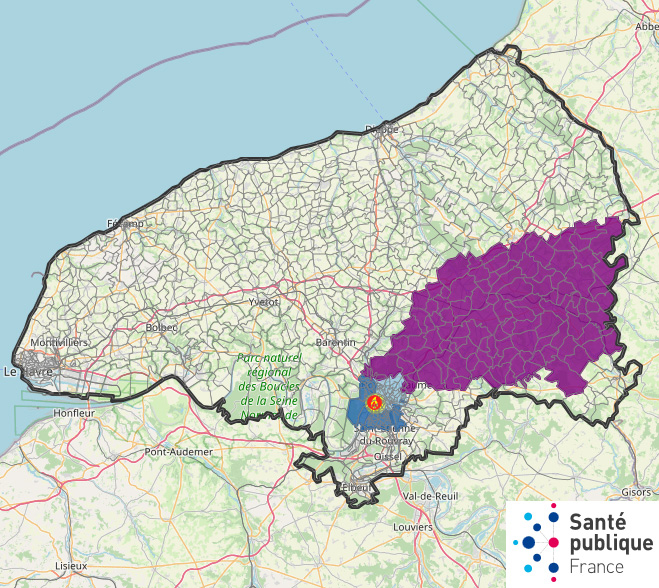 La zone exposée regroupe ainsi 122 communes de Seine-Maritime, dont la plus éloignée est distante d’environ 60 kilomètres du lieu de l’incendie, et réunit une population totale de 340 000 personnes. Elle a été divisée en quatre strates géographiques :