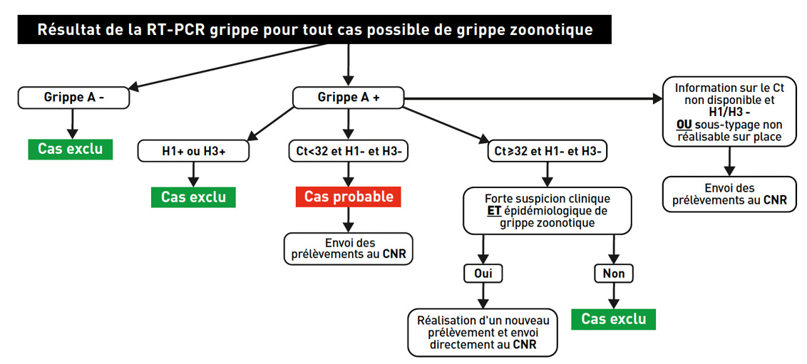 Le patient doit alors consulter un médecin afin qu’un test RT-PCR lui soit prescrit pour identifier le le virus grippal et les sous-types de virus grippaux saisonniers. Si le test est positif pour un virus grippal de type A et négatif ou peu concluant pour les sous-types saisonniers H1N1 et H3N2, le patient correspond à la définition d’un cas probable de grippe aviaire.