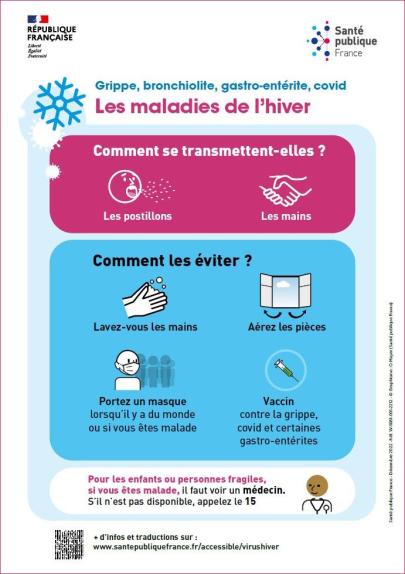 De nombreux virus circulent l'hiver, comme la bronchiolite, la gastro-entérite, la grippe, le covid. Cette affiche d'information sur les maladies de l'hiver, créée collectivement par des professionnel.le.s intervenant auprès des personnes précaires ou vulnérables, rappelle le mode de transmission de ces virus et comment les éviter.