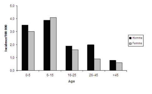 Comme les années antérieures, les taux annuels d’incidence en 2011 étaient globalement plus élevés chez les hommes que chez les femmes et chez les moins de 15 ans que pour les autres classes d’âge.