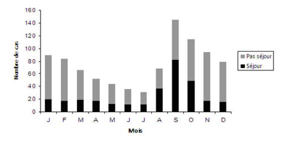 En 2011, 35 % des cas déclarés appartenaient à un épisode de cas groupés ayant fait l’objet d’investigation par les Agences Régionales de Santé