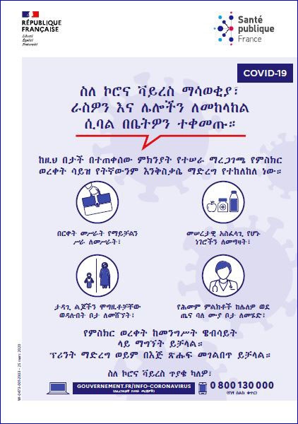 Cette affiche en amharique à destination du grand public indique qu'il faut rester chez soi pour se protéger et protéger les autres du coronavirus (Covid-19), elle précise les cas dans lesquels les déplacements sont autorisés. Titre :