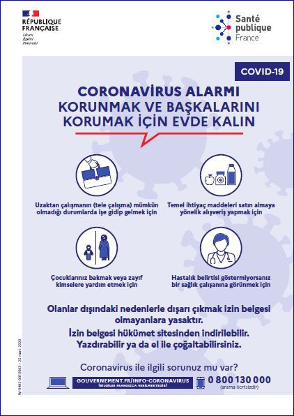 Cette affiche en turc à destination du grand public indique qu'il faut rester chez soi pour se protéger et protéger les autres du coronavirus (Covid-19), elle précise les cas dans lesquels les déplacements sont autorisés. Titre : Coronavirus alarmi korunmak ve başkalarini korumak için evde kalin.