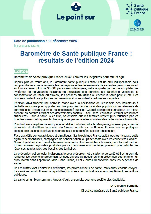 Depuis plus de trente ans, le Baromètre de Santé publique France est un outil indispensable pour comprendre les comportements, les perceptions et les déterminants de santé des personnes vivant en France. Avec plus de 35 000 personnes interrogées, cette enquête permet de compléter les systèmes de surveillance existants en recueillant des données sur l'adhésion vaccinale, la consommation de tabac ou d'alcool, les pensées suicidaires ou encore la santé perçue, etc. Ces données guident les politiques de prévention et aident à réduire les inégalités. Le Baromètre 2024 de Santé publique France marque une avancée significative dans l'analyse de l'état de santé dans la région. Pour la première fois, il offre une vision fine et détaillée à l'échelle régionale, permettant d'aller au-delà des seules tendances nationales. Cette édition inaugure une série d'indicateurs qui seront suivis dans les prochaines versions du Baromètre afin notamment d'analyser leurs évolutions. Les résultats permettent dès à présent de situer la région au regard des thèmes étudiées et de soulever des hypothèses quant aux variations observées selon l'âge, le genre, la profession, les catégories socio-professionnelles, le type de ménage et la zone d'habitation (urbain/rural). Les associations observées entre ces variables pourront faire l'objet d'analyses approfondies, afin de mieux cerner les facteurs influençant la santé perçue et les déterminants de santé. Cette approche territoriale apporte une valeur ajoutée majeure : elle renseigne sur la situation régionale, qu'il s'agisse des comportements, des perceptions ou de l'exposition aux déterminants sociaux de la santé.