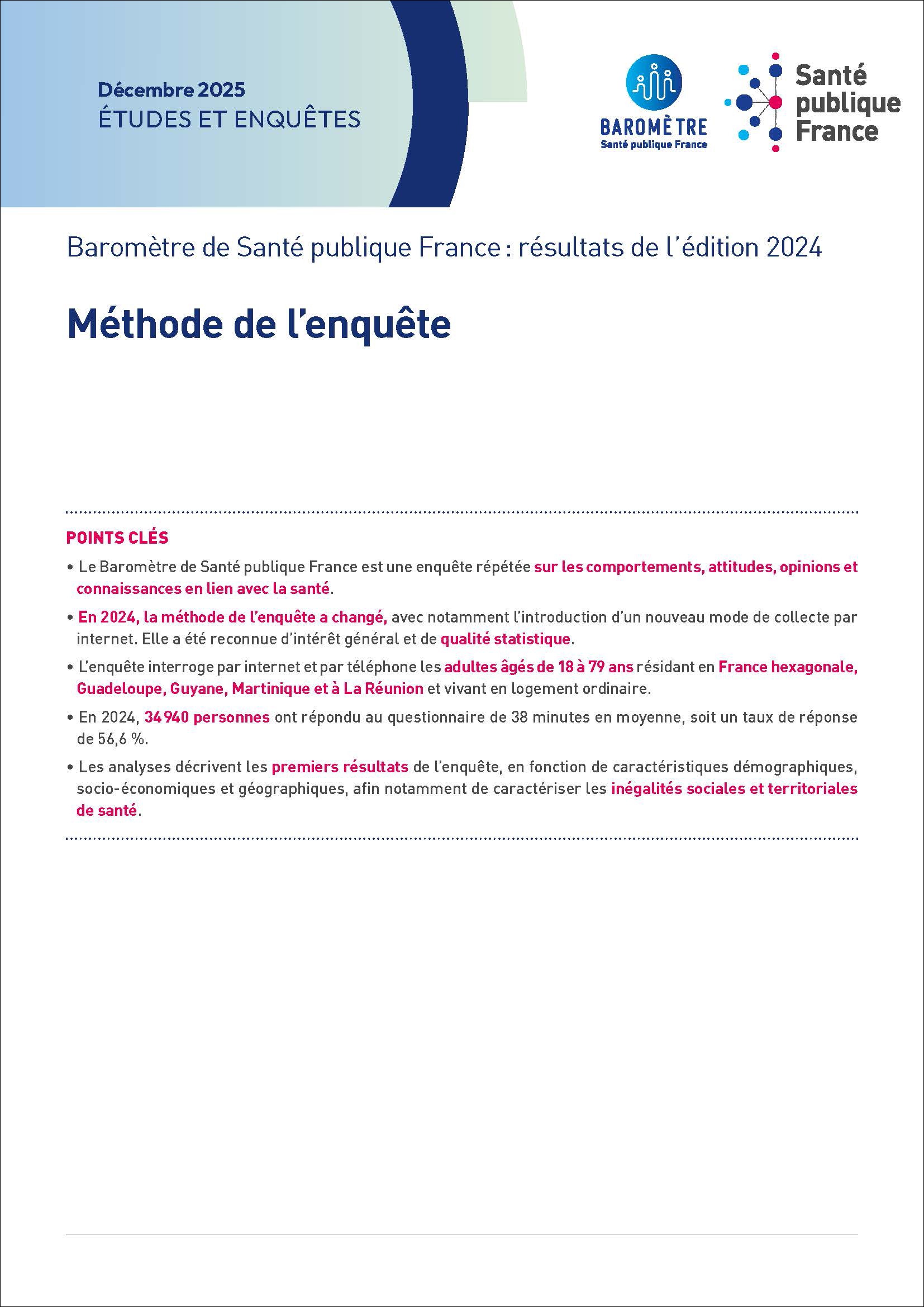 Le Baromètre de Santé publique France est une enquête répétée sur les comportements, attitudes, opinions et connaissances en lien avec la santé. En 2024, la méthode de l'enquête a changé, avec notamment l'introduction d'un nouveau mode de collecte par internet. Elle a été reconnue d'intérêt général et de qualité statistique. L'enquête interroge par internet et par téléphone les adultes âgés de 18 à 79 ans résidant en France hexagonale, Guadeloupe, Guyane, Martinique et à La Réunion et vivant en logement ordinaire. En 2024, 34 940 personnes ont répondu au questionnaire de 38 minutes en moyenne, soit un taux de réponse de 56,6 %. Les analyses décrivent les premiers résultats de l'enquête, en fonction de caractéristiques démographiques, socio-économiques et géographiques, afin notamment de caractériser les inégalités sociales et territoriales de santé.