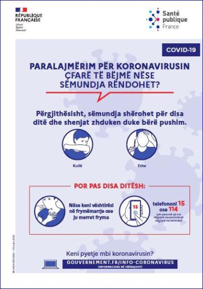 Cette affiche en albanais indique la conduite à tenir quand on ressent des symptômes graves de la maladie. Titre : Paralajmërim për coronavirus : çfarë të bëjmë nëse sëmundja rëndohet?