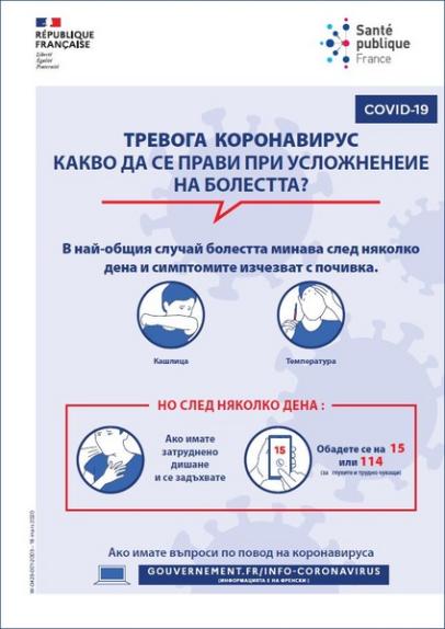 Cette affiche en bulgare indique la conduite à tenir quand on ressent des symptômes graves de la maladie. Titre : ТРЕВОГА КОРОНАВИРУС : КАКВО ДА СЕ ПРАВИ ПРИ УСЛОЖНЕНЕИЕ НА БОЛЕСТТА?