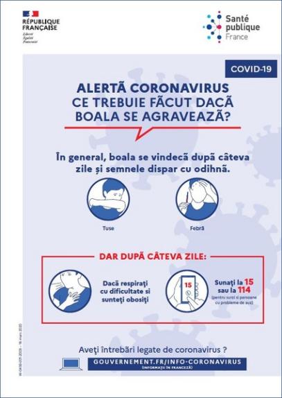 Cette affiche en roumain indique la conduite à tenir quand on ressent des symptômes graves de la maladie. Titre : Alertã coronavirus : ce trebuie fãcut dacã boala se agraveazã?