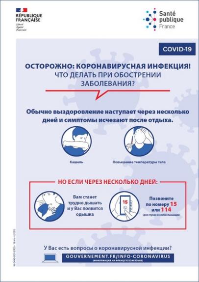 Cette affiche en russe indique la conduite à tenir quand on ressent des symptômes graves de la maladie. Titre : ОСТОРОЖНО: КОРОНАВИРУСНАЯ ИНФЕКЦИЯ! ЧТО ДЕЛАТЬ ПРИ ОБОСТРЕНИИ ЗАБОЛЕВАНИЯ?