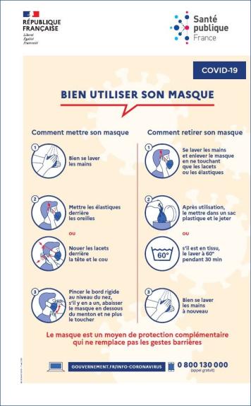 Cette affiche présente les différentes étapes de mise en place et de retrait du masque pour limiter les contaminations.