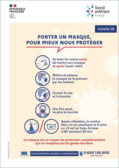 Cette affiche illustre les principales recommandations sur le port du masque grand public.