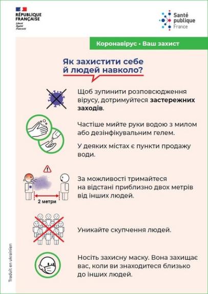 Fiche d'information en langue ukrainienne adaptée aux personnes vulnérables et notamment celles vivant en lieu de vie collectif ou habitat précaire et rappelant les gestes barrière et les moyens de se protéger du Covid-19.