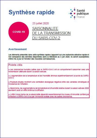 Les éléments présentés dans cette synthèse rapide s'appuient sur une recherche sélective rapide et non exhaustive des données disponibles dans la littérature au 4 juin 2020. Ils seront susceptibles d'être mis à jour en fonction des nouvelles connaissances. Points clés : Les coronavirus humains autres que le SARS-CoV-2 ont un comportement saisonnier avec une transmission atténuée durant la saison estivale. L'augmentation de la température et de l'humidité diminue expérimentalement la survie du SARS-CoV-2. Plusieurs études montrent une corrélation écologique négative entre ces variables climatiques et l'incidence de l'infection. Néanmoins, les augmentations de température et d'humidité relative durant la saison estivale 2020 devraient avoir un effet limité sur la diffusion. L'effet à long terme de la saisonnalité dépendra essentiellement du niveau d'immunité conféré par l'infection à SARS-CoV-2 ou par l'immunité croisée avec les autres coronavirus.