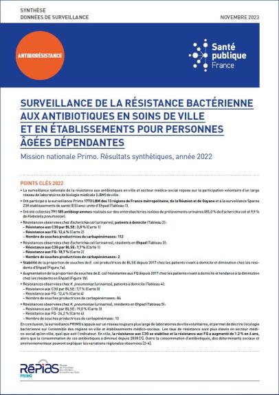 Surveillance de la résistance bactérienne aux antibiotiques en soins de ville et en établissements pour personnes âgées dépendantes. Mission nationale Primo. Résultats synthétiques, année 2022