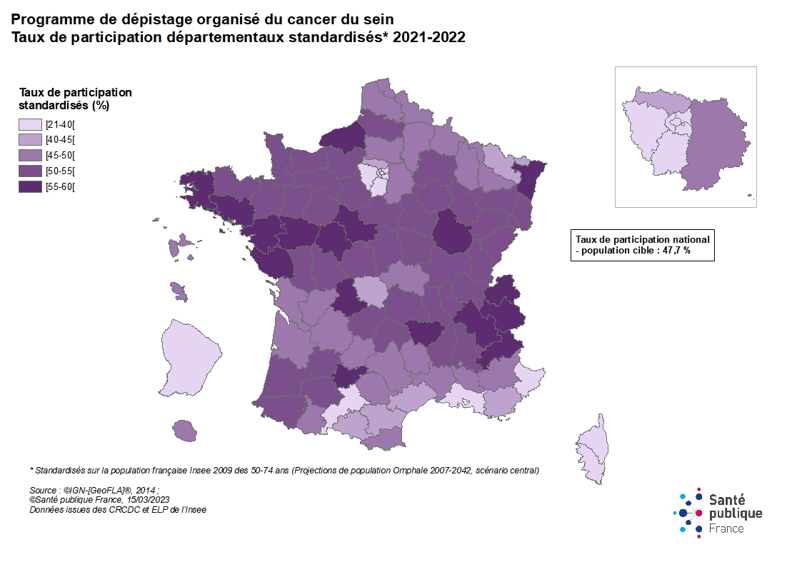 Le programme de dépistage organisé du cancer du sein français invite tous les deux ans les femmes de 50 à 74 à effectuer un examen clinique des seins et une mammographie de dépistage. Il propose un bilan diagnostic immédiat en cas de résultats suspect et une deuxième lecture de chaque mammographie normale en première lecture. Le programme est généralisé à tout le territoire français depuis 2004. Le dépistage est coordonné au niveau régional par les Centres Régionaux de Coordination de Dépistage des Cancers (CRCDC). Les taux de participation à ce programme, calculés pour les années 2005 à 2021, sont présentés ci-dessous, au niveau national, départemental et régional.