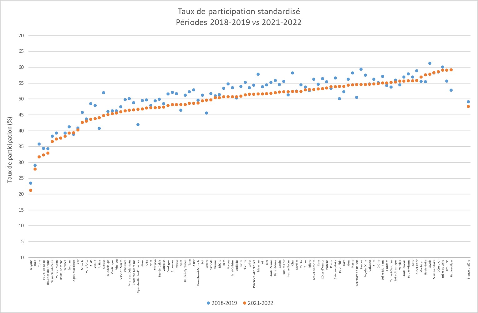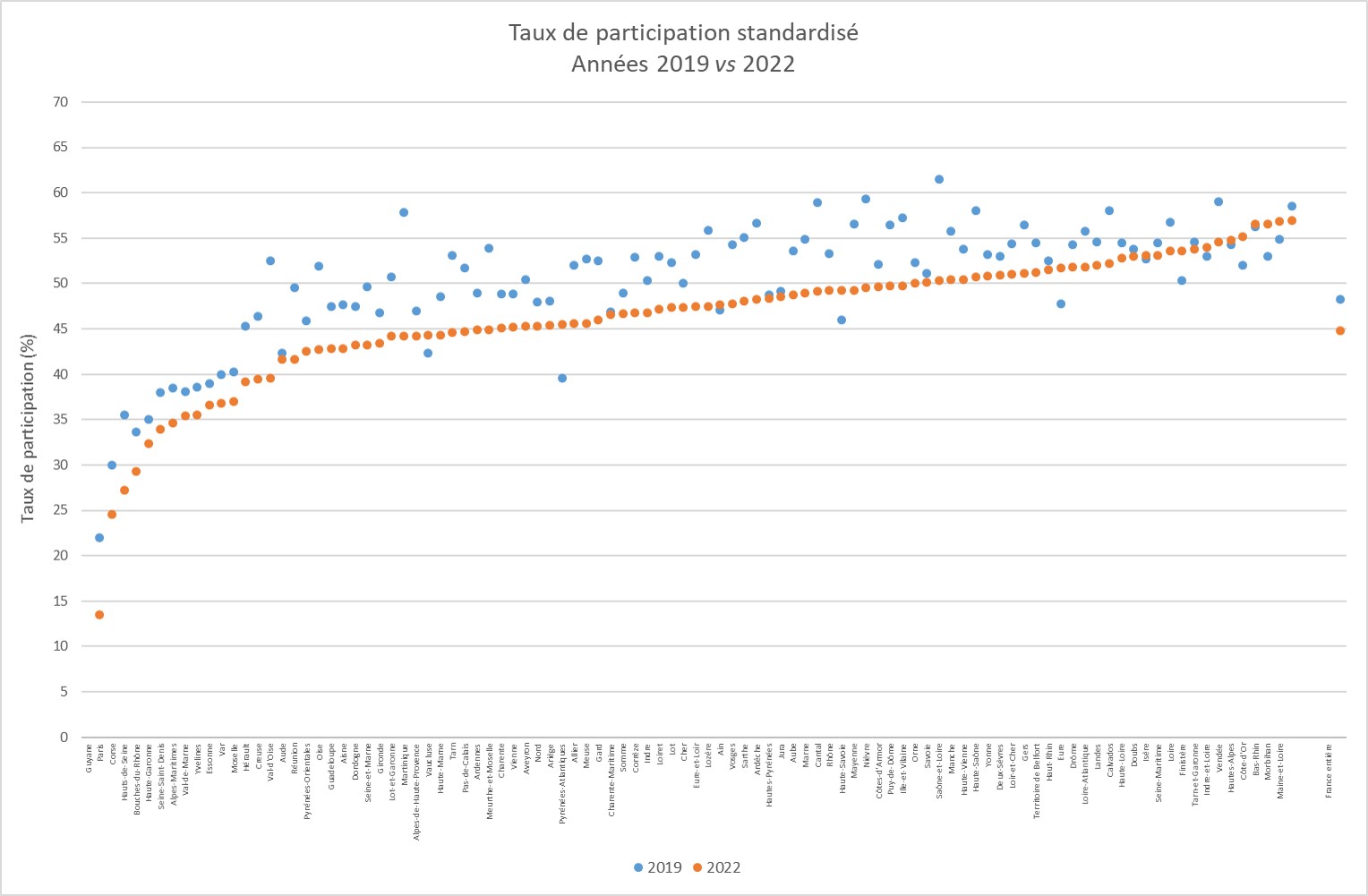 La participation par département, pour l’année 2022, varie de 13,5 % en Guyane à 57,0 % dans le Maine-et-Loire.