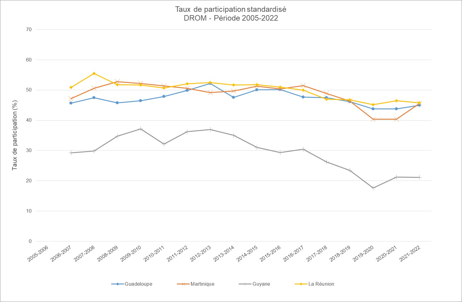 Les tendances temporelles de la participation sont relativement similaires par région, à l’exception de la Guyane. Dans ce territoire, un décrochage inquiétant est observé depuis 2016.