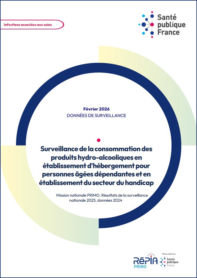 Introduction : L'hygiène des mains par friction hydro-alcoolique (FHA) est la technique de référence pour prévenir la transmission croisée des micro-organismes, notamment les agents responsables des infections respiratoires aiguës, des gastro-entérites et la dissémination des bactéries multirésistantes aux antibiotiques dans les établissements d'hébergement pour personnes âgées dépendantes (Ehpad) et en établissements médico-sociaux du secteur du handicap. Cette surveillance s'intègre dans les objectifs de la Stratégie nationale 2022-20271 et vise à quantifier le respect de l'hygiène des mains dans les établissements par le suivi d'un proxy-indicateur " Nombre de frictions hydro-alcooliques réalisées par les professionnels pour une journée d'hébergement d'un résident en établissement médico-social " (= estimation par une mesure indirecte) basé sur les consommations annuelles de produits hydro-alcooliques (PHA). Méthode : Du 1er mars au 15 juin 2025, les Ehpad et les établissements ciblés du secteur du handicap (EMS-H : EAM/FAM, MAS, IME, IEM, EEAP) de France métropolitaine et territoires ultramarins ont été sollicités pour participer à la surveillance. Des informations organisationnelles (statut de l'établissement, disponibilité d'une équipe ou d'une expertise d'hygiène (EOH/EMH), dernier GIR moyen pondéré calculé [GMP]), les consommations annuelles de PHA (volume acheté de PHA en litres par an) et l'activité des établissements (nombre total de journées d'hébergement) ont été collectées pour l'année 2024. La collecte de données a été effectuée via un formulaire de saisie en ligne, accessible de manière sécurisée. Le nombre de frictions hydro-alcooliques effectuées par les professionnels ; les intervenants extérieurs, les visiteurs et résidents par journée d'hébergement d'un résident a été estimé à l'aide de la formule suivante : (volume de PHA [litres] x 1 000) divisé par (nombre annuel de journées d'hébergement x 3 ml), basé sur l'hypothèse qu'une FHA nécessitait 3 ml de PHA. L'analyse statistique a été réalisée à l'aide du test de Wilcoxon. Résultats : Un total de 2 331 Ehpad français ont participé à la surveillance (soit 31,4% des Ehpad). Pour l'année 2024, le nombre médian estimé de FHA par journée d'hébergement d'un résident était de 1,53 (intervalle interquartile (IIQ) : 1,00-2,21). Sur le plan organisationnel, 62,4% des Ehpad étaient des structures publiques, 24,6% sans but lucratif et 13,0% privées. Dans 52,9% des Ehpad, un référent hygiène a été désigné et une équipe d'hygiène (EOH/EMH) était disponible dans 89,7% des Ehpad. Une consommation de PHA significativement plus élevée était observée pour les Ehpad avec les caractéristiques suivantes : statut public (médiane : 1,66 FHA par journée d'hébergement d'un résident vs 1,21 pour les Ehpad à but non lucratif ; p