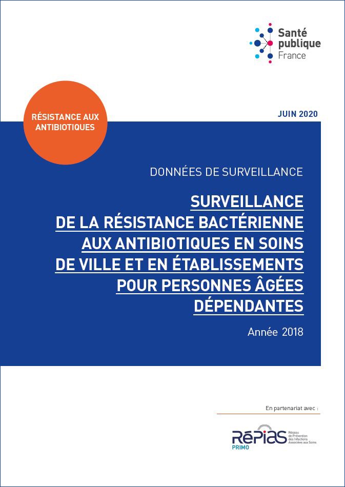Introduction - En santé humaine, environ 80% des antibiotiques sont prescrits en médecine de ville. Les résidents d'établissements d'hébergement pour personnes âgées dépendantes (Ehpad), du fait de leur fragilité et des échanges permanents avec le secteur sanitaire, représentent une population à risque de portage ou d'infection à bactéries multirésistantes aux antibiotiques. Ce rapport décrit les données nationales 2018 de surveillance de la résistance aux antibiotiques en ville et en secteur médico-social. Méthode - Du 1er janvier au 31 décembre 2018, les antibiogrammes d'E. coli, K. pneumoniae, et S. aureus isolés de prélèvements à visée diagnostique ont été collectés dans le réseau de 742 laboratoires de biologie médicale (LBM) répartis sur 11 régions de France. Les données administratives et microbiologiques ont été téléchargées par les LMB sur une plateforme électronique dédiée à la surveillance. Les souches isolées de patients vivant à domicile ou résidents d'établissements médico-sociaux ont été incluses dans l'analyse. Les patients hospitalisés et les échantillons de dépistage ont été exclus. Après dédoublonnage, les taux de résistance correspondaient au nombre de souches résistantes à un antibiotique divisé par le nombre total de souches. Des analyses statistiques ont été effectuées en utilisant le test de Student ou une analyse de variance. Des intervalles de confiance à 95% ainsi que le pourcentage pondéré en fonction des laboratoires ont été déterminés. Résultats - En 2018, un total de 424 965 (98,7%) antibiogrammes réalisés sur des souches d'entérobactéries isolées de prélèvements urinaires (90,4% d'Escherichia coli et 6,1% de Klebsiella pneumoniae) ont été recueillies. Chez les patients à domicile, 3,2% des souches d'E. coli isolées étaient résistantes aux céphalosporines de troisième génération (C3G), dont 2,8% par production de bêta-lactamase à spectre étendu (BLSE). Ce taux était respectivement de 7,7% et 9,3% chez des résidents d'Ehpad indépendants et intégrés à un ES. La résistance aux fluoroquinolones chez E. coli était de 11,0% pour les souches isolées de patients à domicile, 18,7% de celles isolées de résidents d'Ehpad. Les proportions annuelles d'E. coli BLSE et résistant aux fluoroquinolones tendaient à diminuer de 2015 à 2018. Chez K. pneumoniae, la production de BLSE concernait 7,2% des souches isolées de patients à domicile, et respectivement 18,8% et 22,6% de celles isolées chez des résidents d'Ehpad indépendants et intégrés à un ES. La proportion de souches résistantes aux fluoroquinolones était chez les patients vivant à domicile de 10,8% et chez les résidents d'Ehpad indépendants de 24,3 et 29,3% dans les Ehpad intégrés à un ES. Parmi les 24 804 antibiogrammes de S. aureus collectés, 76,6% étaient issus de prélèvements superficiels. Chez les patients vivant à domicile, 9,0% des S. aureus étaient résistant à la meticilline, et respectivement 39,9% et 37,6% dans les Ehpad indépendants ou intégrés à un ES. Conclusion - La surveillance Primo permet de décrire l'écologie bactérienne en secteurs de ville et médico-social, où 93% des antibiotiques sont consommés. La diminution du taux de BLSE et du taux de résistance aux fluoroquinolones sont des résultats encourageants et incitent à amplifier les actions en faveur de la maîtrise de l'antibiorésistance dans ces secteurs.