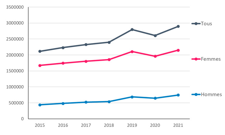 En 2023, 3,0 millions de personnes ont été dépistées au moins une fois pour une infection à Chlamydia trachomatis, soit un taux national de dépistage de 44 pour 1 000 habitants (Figure 1).